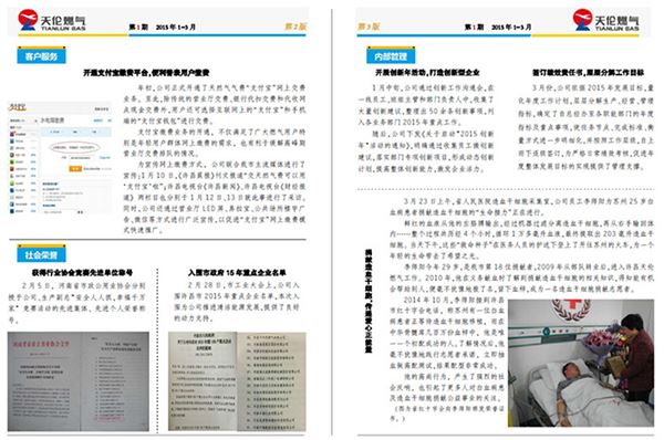 《動態(tài)》首期,分別從“安全工作”、“工程建設(shè)”、“內(nèi)部管理”、“客戶服務(wù)”、“宣傳培訓(xùn)”、“社會榮譽(yù)”六個方面,以圖文并茂的方式呈現(xiàn)了許昌公司簽訂安全責(zé)任書、護(hù)城河管網(wǎng)改造、開展“創(chuàng)新年活動、開通公眾微信號、設(shè)立《晨報》宣傳專欄、入圍市政府重點企業(yè)等重要事項,全面、詳實的反映了公司第一季度重點工作動態(tài)。