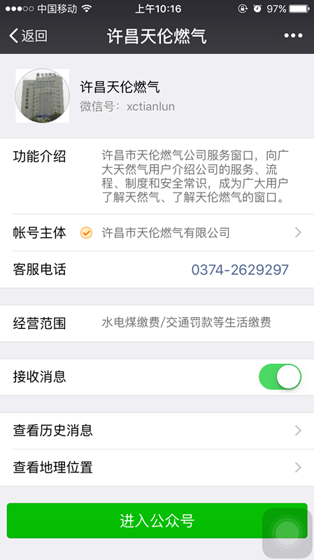 在微信公眾號中,選擇“許昌天倫”公眾號,點擊下方“進入公眾號”