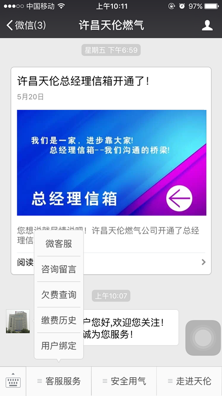 許昌天倫公司為了更好的服務(wù)廣大天然氣用戶,于2016年5月25日,“許昌天倫燃氣”微信公眾號新開通了“微客服”業(yè)務(wù),通過微信公眾號,天然氣用戶可以在微客服中進行欠費查詢、繳費歷史查詢、以及在線了解天然氣等服務(wù)。